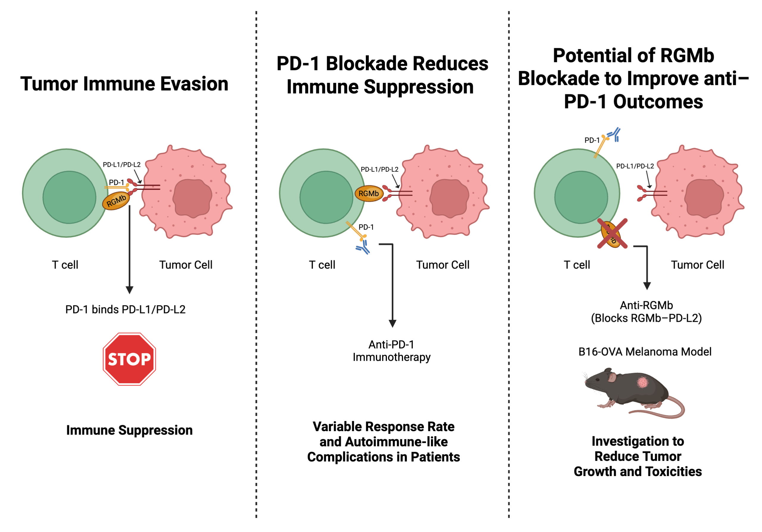 Programmed cell death protein 1 (PD-1) is an inhibitory immune checkpoint receptor expressed on T cells. PD-1 limits immune activation to maintain tolerance, while its ligands PD-L1 and PD-L2 can be expressed on tumor cells to regulate immune suppression and evade detection. Although PD-1 blockade has led to strong clinical responses in multiple cancers, a significant portion of patients do not respond. This project investigates the role of Repulsive Guidance Molecule b (RGMb), which was recently described as a promising target to improve antitumor responses in models of microbiome dependent resistance to PD-1 blockade therapy. Using the B16-OVA melanoma model, this project will assess how anti-RGMb treatment alters tumor growth and immune regulation in vivo, complemented by in vitro systems to further interrogate its role in relevant cell types. Parallel studies in autoimmune models will examine how RGMb influences immune tolerance, providing insight into mechanisms that may underlie harmful immune responses associated with checkpoint immunotherapy and guiding the development of safer, more effective cancer treatments.
