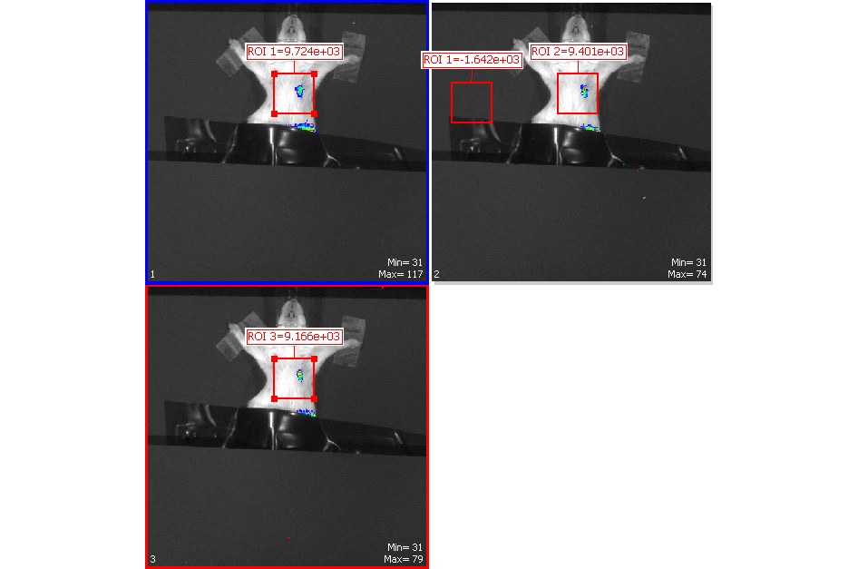 For project 1: Metastases of mice with human breast cancer cell 4t1 were imaged using IVIS optical imaging three weeks post cell injection. Luciferase was used as reporter to visualize the tumors. Luciferase is a gene expressed in tumor cells that interacts with a luciferin substrate that is injected into the mice prior to imaging. This interaction produces the light that is picked up by IVIS. Region of Interest (ROI) values designates the borders of the tumors.