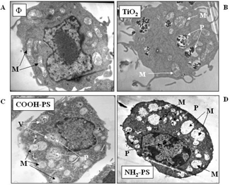 Nanoparticles of varying materials (gold, titanium dioxide, graphene oxide etc.) have been shown to have radio-/photo-sensitizing properties. These sensitizers increase sensitivity of cancer cells to damage during radiation therapy. By implanting a nanoparticle-loaded radiation therapy biomaterial (RTB), such as a fiducial, into the tumor, nanoparticles can be released in situ. This method can lead to local damage enhancement while sparing healthy tissue. Use of a RTB for delivery of nanoparticles also allows for sustained release of nanoparticles directly into the tumor environment minimizing systemic toxicities. Cellular uptake of nanoparticles is primarily facilitated via receptor-mediated endocytosis.. Gold, titanium dioxide, and graphene oxide nanoparticles in conjunction with radiotherapy have been shown to disrupt the cellular function of tumors via the induction of reactive oxygen species (ROS). This leads to oxidative stress and the release of cytochrome c which causes apoptosis. The nuclear pore size exclusion for the diffusion of molecules is around 9 nm. Thus, nanoparticles larger than 9 nm have been shown to accumulate primarily in the cytosol while smaller molecules are able to enter the nuclear space. It is important to understand the localization of various nanoparticles as a function of time in order to determine the most effective timing of exposing the tumor to radiation. This can be accomplished by treating cancer cells with nanoparticles and using electron microscopy to determine localization over the course of time.