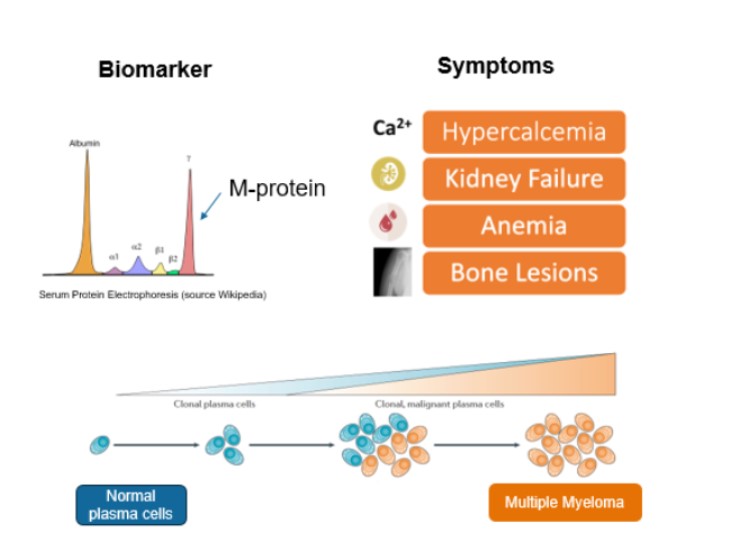 Multiple Myeloma (MM) is a cancer affecting the plasma cells, impacting the body’s ability to produce antibodies to fight infections. The disease is incurable with high morbidity and is multisystemic, resulting in kidney failure, anemia, and bone lesions. The current clinical diagnostic for MM and earlier precursor conditions is a SPEP assay; this poses some challenges, as it is subject to human bias, is lengthy, and can be imprecise for those with precursor conditions. The goal of the Ghobrial Lab is to use more sensitive techniques to screen high-risk populations, namely first-degree relatives and those with African ancestry, for precursor conditions to increase transparency about their risk for developing disease. For my project, I analyzed samples from the PROMISE study, which screens high-risk individuals for disease progression to Smoldering Multiple Myeloma (SMM) or MM. The progression of MM is characterized by an increase in a monoclonal antibody called M-protein. I utilized highly sensitive techniques to screen these samples for monoclonal abnormalities, such as MALDI-TOF Mass Spectrometry and protein analysis through the Optilite Protein Analyzer and assigned diagnoses for these high-risk patients.