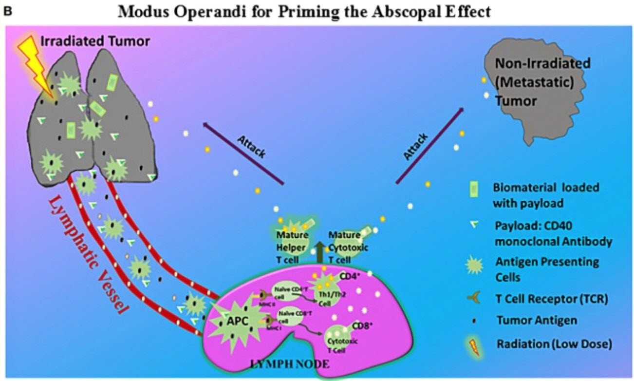 The figure displays the abscopal effect, the treatment of a primary tumor and it’s affects of regression on distant metastatic tumors. Gold nanoparticles (GNP) are injected into the primary tumor. GNP then results in an enhancement of the effect of the radiation on the primary tumor. With the addition of Anti-CD40, an immune response is generated resulting in the regression of distant metastatic sites. Source: Moreau M, et al. Priming the Abscopal Effect Using Multifunctional Smart Radiotherapy Biomaterials Loaded with Immunoadjuvants. 2018;8:56