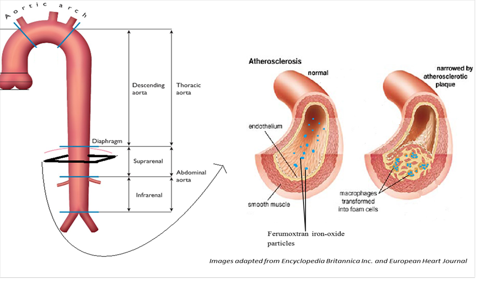 Radiation therapy can accelerate atherosclerotic changes, which can lead to serious and significant post-treatment complications for cancer patients. Arthrosclerosis is initially asymptomatic, eventually resulting in an acute onset of symptoms most commonly heart attack and death. It involves the buildup of inflamed plaques in artery walls, characterized by an increased macrophage presence in plaques. Iron oxide particles are able to be taken up from macrophages inside in aortic plaques, which points to their use as contrast agents and benefit as a non-invasive means of diagnosing arthrosclerosis {1]. We are investigating the use Supermagnetic Iron Oxide particle, Ferumoxtran, as an imaging agent for patients with pancreatic cancer. Using changes in T2* values, the amount of atherosclerotic changes in each patient cohorts can be compared. We will identify 3 cohorts of patients who had both pre and 24 hr post scans with Ferumoxtran as a contrast agent: patients without pancreatic cancer, patients with pancreatic cancer who have not received neo-adjuvant therapy, and patients who have pancreatic cancer and who have received neo-adjuvant therapy. The changes in T2* will be compared among each cohort and also to the values from a previous study done with another iron oxide agent Ferumoxytol. Cohorts of patients with specific malignancies also will be established, and the average T2* values of each cohort will be compared to see if there is a relationship between atherosclerotic progression and certain malignancies. Finally, T2* values of the suprarenal and infrarenal aorta will be compared to see if there is a significant difference in atherosclerotic changes between the two sections of the aorta. [1]Alam SR, Stirrat C, Richards J, Mirsadraee S, Semple SK, et. al. Vascular and plaque imaging with ultrasmall superparamagnetic particles of iron oxide. J Cardiovasc Magn Reson. 2015, 17(83): 10.1186/s12968-015-0183-4. https://jcmr-online.biomedcentral.com/articles/10.1186/s12968-015-0183-4