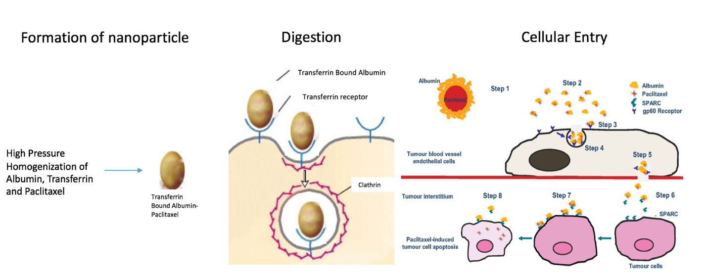 Taxanes are mitotic inhibitors often used in the treatment of solid tumors. These drugs include the common chemotherapeutic agents’ paclitaxel and docetaxel which exhibit hydrophobic properties requiring the use of harmful organic solvents for intravenous administration. The oral administration of these medications are usually unexplored due to issues of irregular absorption, uncertain bioavailability, and patient compliance. If uniquely designed, oral chemotherapy can display higher antitumor activity and lower systemic toxicity than similar intravenous regimens. Human serum albumin (HSA), with diverse biological properties, can act as a carrier for hydrophobic molecules. The heart shaped protein has a hydrophobic pocket in subdomain IIA which exhibits a natural affinity for these drugs. FDA approved Abraxane (nab-paclitaxel) utilizes this property for improved treatment of metastatic breast cancer, metastatic pancreatic cancer and non-small cell lung cancer. HSA bound taxanes accumulate in the rapid angiogenic microenvironment of tumors and exploits the overexpressed albumin receptor gp60 leading to specific uptake and distribution. For safe digestion, the HSA-paclitaxel complex can further be modified with transferrin through high pressure homogenization. This final protein complex can then be evaluated for oral use. This novel approach could provide important results for further work into the development of oral chemotherapy.