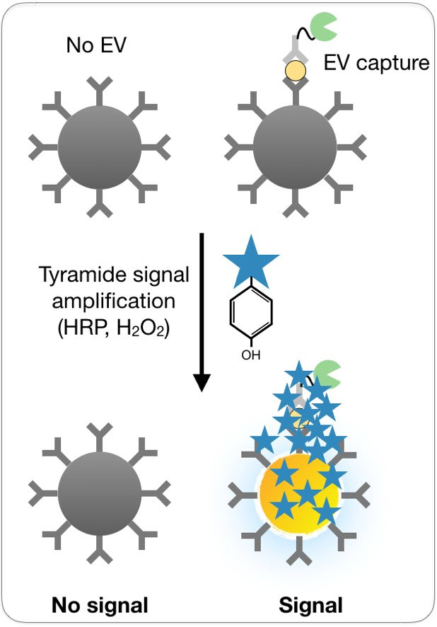 This image shows the process of DEST. Lysed EV is captured on antibody coated magnetic beads (via a specific capture antibody). EV proteins are labeled with a biotinylated detection antibody followed by streptavidin-HRP. Signal is then amplified on magnetic beads with tyramide signal amplification. Beads are then measured for signal.