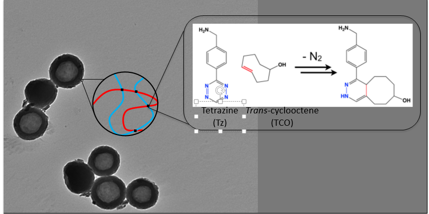 Unpublished electron microscopy image of hyaluronic acid nanoparticles. The schematic illustrates the “click” chemistry reaction between tetrazine (Tz) and trans-cyclooctene (TCO) used to crosslink the polymeric particles.