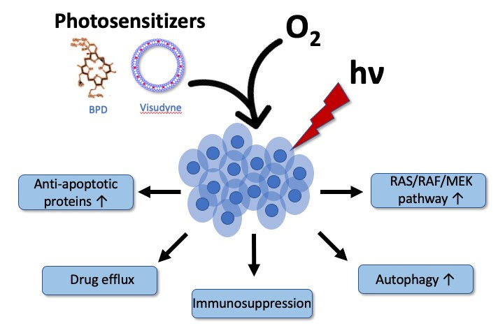 Pancreatic cancer is rarely symptomatic until it has metastasized to other parts of the body. In 2019, it is predicted that about 56,770 people will be diagnosed with pancreatic cancer and about 45,750 will die from it. This is because most pancreatic cancers develop resistance to chemotherapeutic drugs, leaving current treatments like chemotherapy and combination chemo-radiation therapy ineffective. The resistance to existing therapies and the associated low survival rates in pancreatic cancers highlights the need for more effective therapies that can overcome the resistant properties of these cancers. Photodynamic therapy (PDT) provides an alternate treatment modality for chemo-resistant tumors. It involves the irradiation of tumor-localized photosensitizers for the generation of reactive molecular species (RMS) and induction of apoptosis/necrosis. In this study, we use four model pancreatic cancer cell lines: KPC and Pan 02 (mouse pancreatic cancer cell lines); MiaPaCa2 and AsPC-1 (human pancreatic cancer cell lines) to explore the therapeutic effects of PDT. These cell lines represent pancreatic cancers with or without Kras mutation (mutation in Kras leads to treatment resistant tumors) and differential Kras expression levels. In our preliminary studies, we observed variations in photosensitizer uptake efficiency and ROS generation in these cell lines, resulting in differences in PDT efficiency. Further studies will be aimed at comparing the levels of anti-apoptotic proteins (survivin, Bcl2, etc) in these cells and the effect of PDT on their expression. The overarching goal of this study is to further understand the mechanism of resistance in pancreatic cancers in an attempt to develop efficient therapeutic modalities.